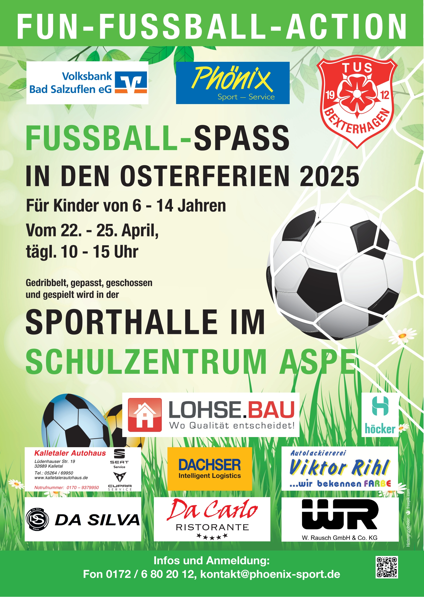 In diesem 9. Fußball-Spaß in den Osterferien beim TuS Bexterhagen haben Mädchen und Jungen im Alter von 6 bis 14 Jahren die Chance, zu zeigen was sie können und darüber hinaus die Möglichkeit, ihr Spiel zu verbessern oder Grundlagen im Fußball zu erlernen. Hierfür stehen lizenzierte Trainer bereit, die ihre Erfahrungen in unterschiedlichen Leistungsklassen sammelten. Zu den fußballerischen Inhalten zählen unter anderem Technik, Individual- und Gruppentaktik, Schusstechnik, Schussgeschwindigkeit, Koordination und Kommunikation. Dazu können auch Inhalte in englischer Sprache angeboten werden. Neben den Übungen und Spielen nimmt das soziale Lernen in der Gruppe einen wichtigen Platz im FußballCAMP ein.